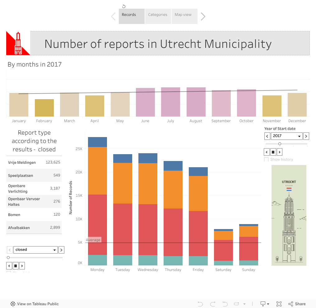 The dashboard is prepared based on the Utrecht Municipality open reports data. The dashboard contains three pages: the records page defines monthly and daily report statistics. The categories page presents the type of reports and the map view presents the location of a report and its category.
